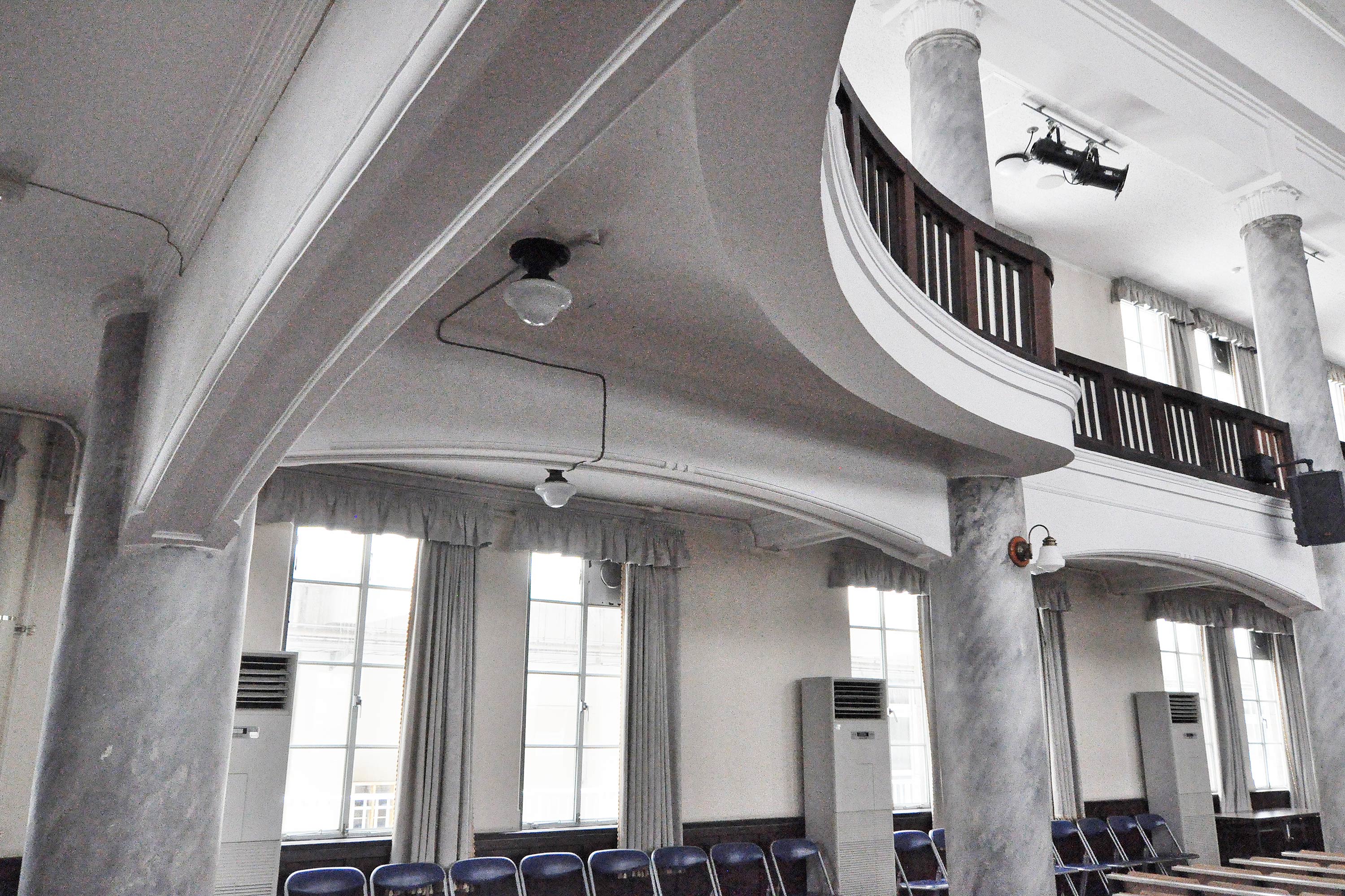 旧制広島高等学校の講堂として建てられ、戦後は広島大学を経て附属中・高校の講堂となりました。ロマネスク復古様式を取り入れ、2階まで通じたバットレス状の外壁、正面入口のアーチ状の扉、濃淡のついた灰漆喰で石材のような質感の円柱や階段手すりなど、様式建築の香りを感じさせる建物です。