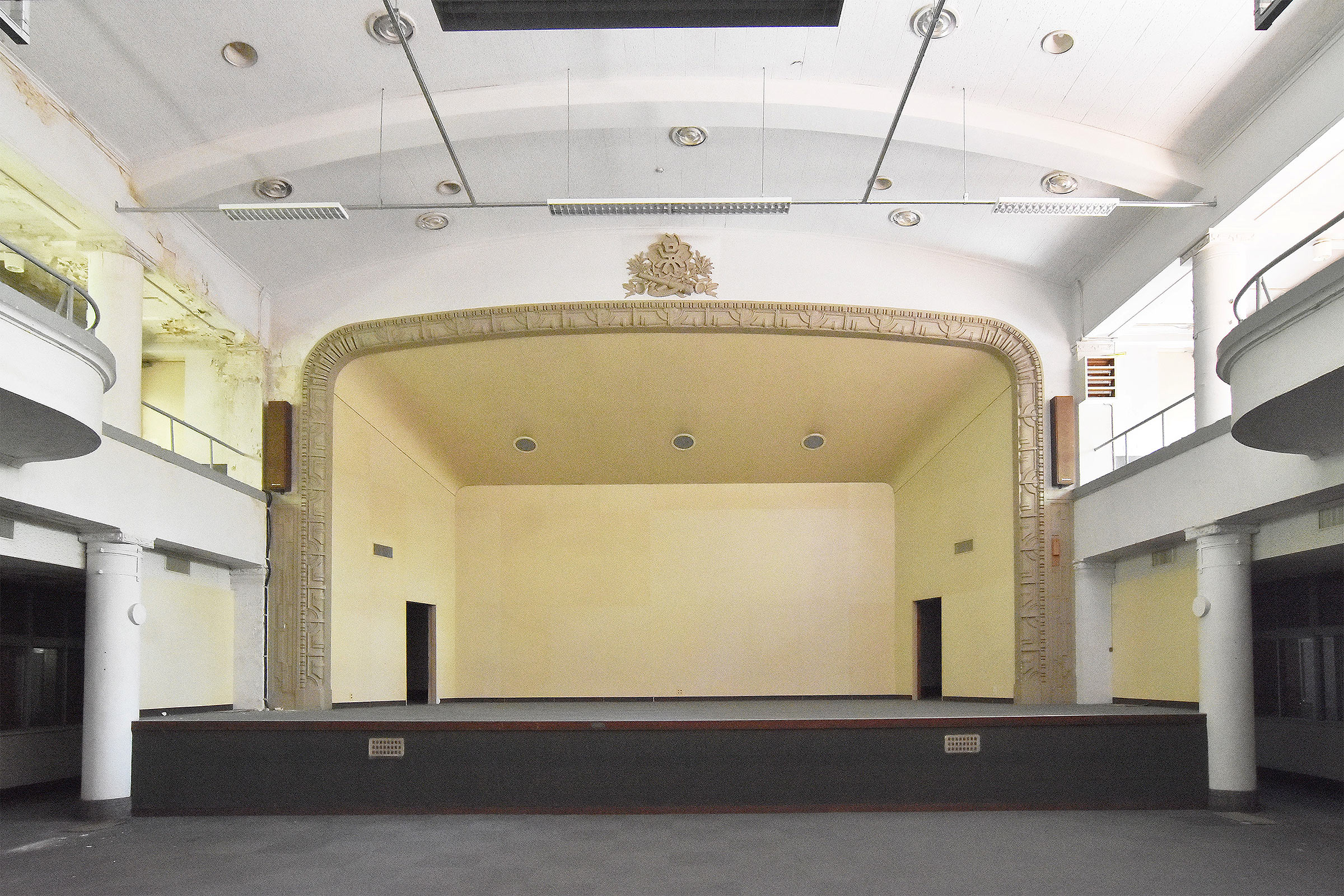 旧軍港ゾーンと市街地の境に建つ旧海軍施設で、水兵達の休息・娯楽・宿泊機能のほか、市民が利用できる売店もありました。ガイドツアーでは青山クラブの中庭部分の外観を見学するほか、桜松館の内部に入り、アールデコ風の装飾が残るホール部分を見学します。