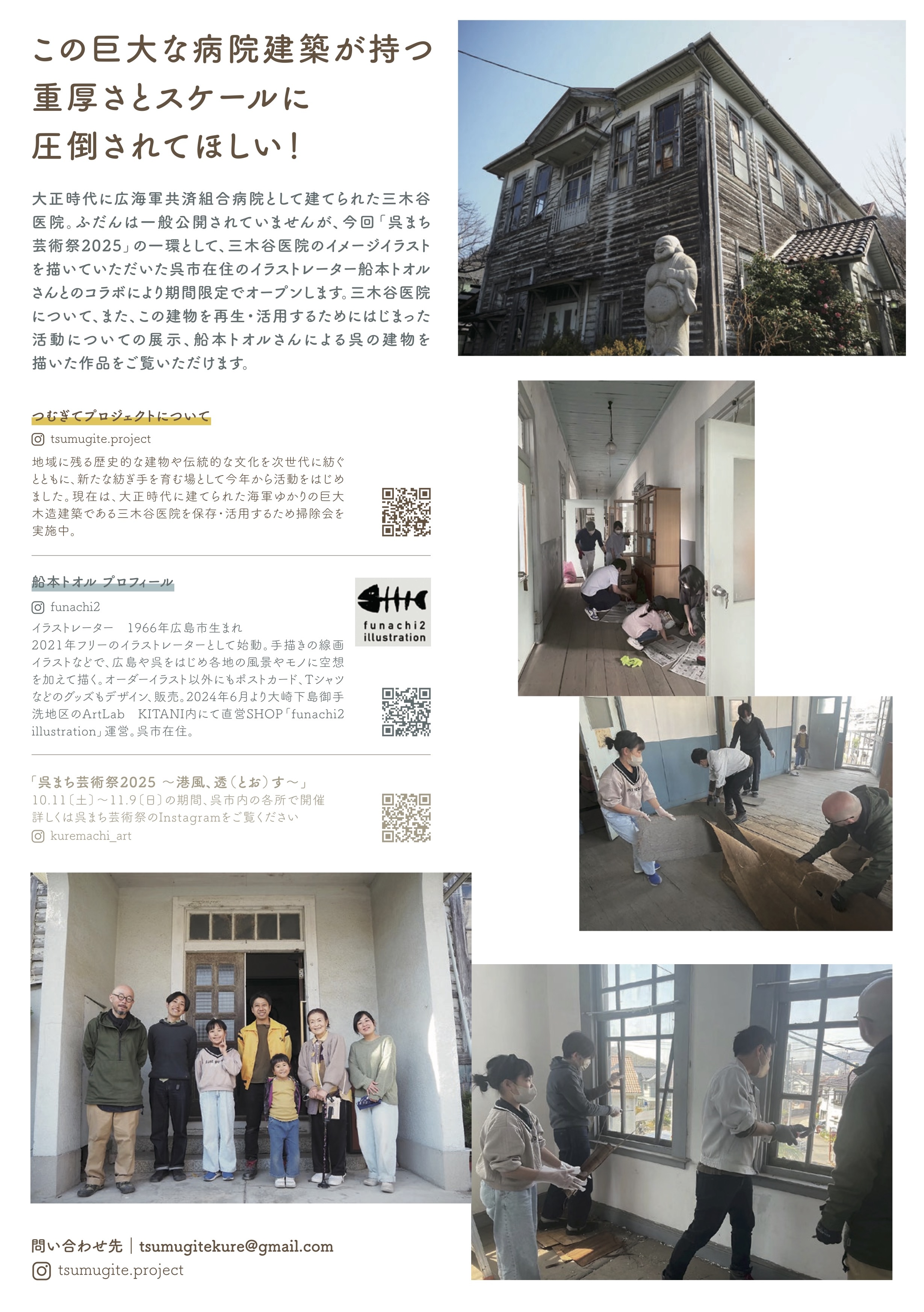@tsumugite.project地域に残る歴史的な建物や伝統的な文化を次世代に紡ぐとともに、新たな紡ぎ手を育む場として今年から活動をはじめました。現在は、大正時代に建てられた海軍ゆかりの巨大木造建築である三木谷医院を保存・活用するため掃除会を実施中。